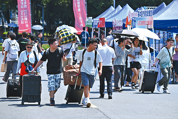 昨日,义乌工商职业技术学院彩旗飘飘,2025级大学新生带着行李在家长陪同下一道前来报到。学校安排了志愿者开展现场引导服务,新生信息录入、手续填写等工作有条不紊进行。