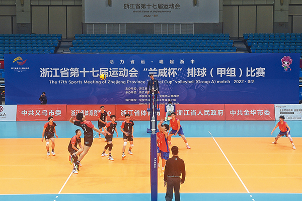 昨日上午8点,省运会排球男子(甲组)比赛迎来半决赛,首战由金华队对阵台州队。在一番激烈角逐后,最终金华队以3:0的比分强势战胜台州队。图中左边着黑色队服的为金华队。(孙航宇)