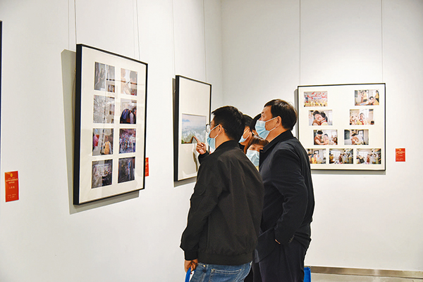 昨日,市民陈先生一家来到市文化广场七墨美术馆,参观“奋进新时代·永远跟党走”2022年市职工书画摄影比赛优秀作品展。