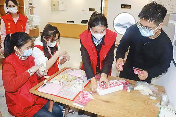 近日,在做好相关疫情防控工作基础上,通惠社区在卿悦府小区党群服务中心开展了一场公益活动。辖区10多名流动党员闻讯赶来,在现场提供免费义诊服务,还与小区居民一起做糕点、香包。