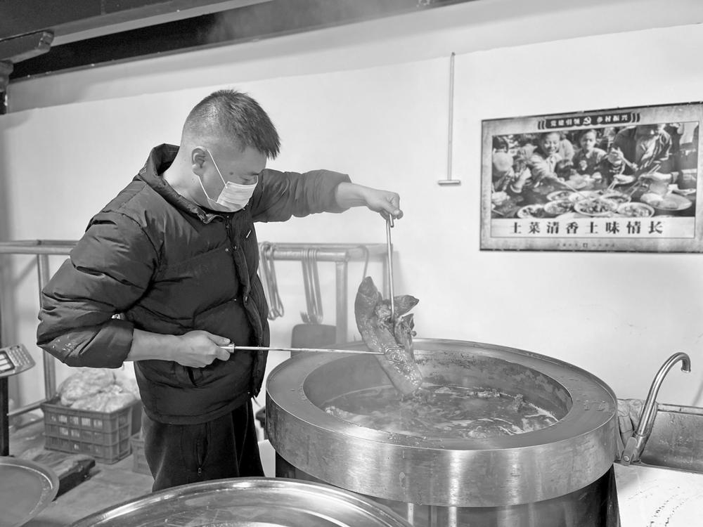 村党总支书记吴光明说,村里一早就宰杀了一头1200斤重的黄牛,邀请游客和村民前来品尝热腾腾的牛杂汤。上溪“牛系列文化”由来已久,牛杂汤更是鲜香爽滑,深受义乌人喜爱。早年潜溪村举办“宋濂文化节”时,曾推出“百桌长宴”品牛汤,吸引远近游客前来。“气温骤降心不慌,滋补养生喝牛汤。上溪老牌大文章,共富路上响当当?!焙壬先忍谔诘呐T犹溃诙崭惺艿脚ㄅǖ呐?,有游客不禁发出感慨。
