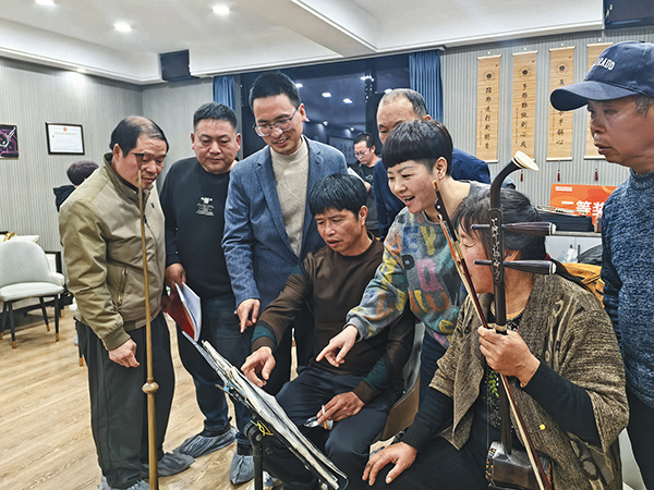 钱旭升(左三)指导村民开展文艺作品创作