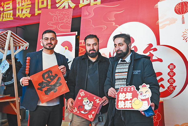 外国旅客在充满新年特色的布景前合影打卡。 全媒体记者 王怿杰 摄