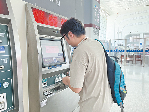 乘客在铁路义乌站自助机上打印纸质火车票和行程信息提示单。