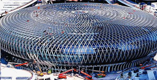 进入市场板块,一个银色巨型圆球建筑以其充满科幻感的造型,吸引人们的注意。据商城集团工作人员介绍,“数贸港”作为全球数贸中心的地标建筑已初具规模。它围绕新品发布、数贸展示、数据交易三大功能定位进行建设,是未来贸易的集聚地和大行业模型的策源地,而这也只是整个市场数字化图景的一个起点。