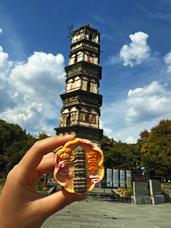 她的灵感源于一份“不甘心”。“看到别的旅游城市都有代表自己文化的小点心,我就想,义乌为什么不能有?”傅亚琴说。为了这份情怀,7月,她就带着团队开始筹备。设计图纸、3D建模、反复打样,过程充满挑战。她甚至跑到赤岸镇古月桥、稠城大安寺塔下实地采风。“站在古月桥下,那种感觉特别不一样,就想把这份属于义乌的印记‘刻’进月饼里。”除了造型的极致追求,傅亚琴在口味上也下足功夫。考虑到当下的健康趋势,她调整配方,减油减糖,并在馅料中融入芝麻、红枣、茯苓等养生食材,饼皮则选用了细腻的桃山皮。
