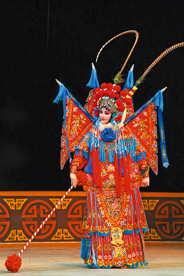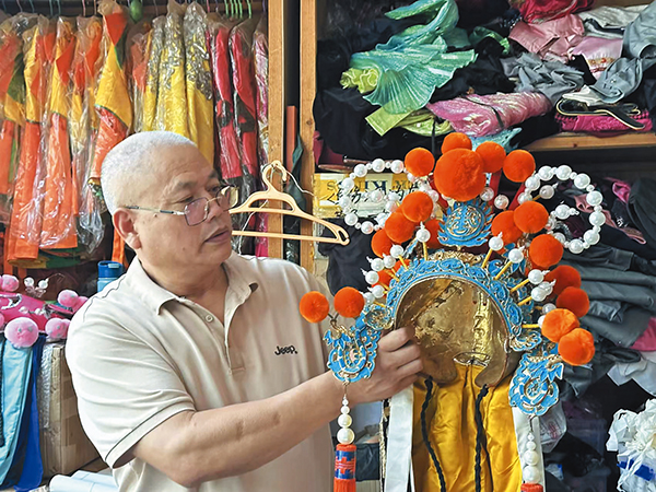 每次排戏,梅立忠都会和导演、演员反复沟通,确保服装色彩、盔帽搭配与舞台效果完美契合,严格遵守传统的穿戴规则。有一次演出,一位戏迷特地来到后台,找到梅立忠,争论关羽“夫子盔”的戴法。从制作工艺到角色搭配,凭着扎实的技艺功底与专业知识,他让对方心服口服,一来二去两人还成了朋友。
