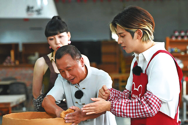 从古法点火、烧制工序,节目嘉宾们边走边认真听取传承人的讲解。当他们触摸龙窑内壁上经年累月的窑汗,仿佛穿越时空,置身历史长河。龙窑是我国窑炉的一种形式,多建在江南坡地上。窑身呈长条形,自下而上,依山就势而建,窑室上覆盖的保温层微微隆起,蜿蜒在半山坡上,形似龙,故名龙窑。龙窑主要采用柴烧形式,利用薪柴作为燃料烧制陶瓷。作为一种古老技艺,柴烧独有的自然落灰釉是电器窑等烧制的陶艺作品所无法呈现的?!叭嗄嘁袢嗝嫱?,得把空气全排出去,不然烧的时候会裂?!背略屏菩恼醋攀蟮奶漳?,原本松散的泥团在他手中渐渐成形,嘉宾们个个跃跃欲试,沉浸式感受陶器制作的乐趣与魅力。选泥、练泥、拉坯……整个过程中,陈云龙叮嘱大家,老规矩不能丢。他举起一个刚拉好的陶坯,看弧度,全凭手感控制,做出温润的线条。
