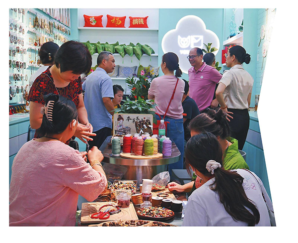 “你可以把青柠果和小桔瓜搭配起来,既新颖又活泼?!痹凇昂杭叶惫绶且攀肿魃唐痰奶逖榍?,手作设计师正耐心地为顾客演示手串搭配技巧。店铺内客流熙攘,创始人王紫钥穿梭其中。为了让国风手作从“可购买”变为“可感知、可体验”,她特意在义乌全球数贸中心的新商铺内增设了手工体验区。这种“零售+体验”模式吸引了大量年轻群体和外籍客商走入店内,开业当天店内人流不断,王紫钥更加确信义乌全球数贸中心这个新窗口,能让传统文化被更多人看见。