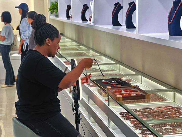 随着市场的不断变化和消费者需求的日益多样化,义乌市场经营主体稳步推进现代化转型,实现从品牌建设到渠道拓展的全面升级。在义乌全球数贸中心内,熵?珠宝商铺店长邹芳正忙着接待中外客商。商铺以绛红色为主色定制展柜,场内一边设置精品区,另一边为普货区,从百元级手串到万元收藏级雕件明码标价,确保让每位顾客选到合适的南红产品?!安簧偻夤蜕滩蝗鲜赌虾欤獳I制作的跨语种短视频能带来新的贸易场景。义乌全球数贸中心给了我们转型升级的平台,让我们有机会将优质南红推向世界?!弊薹妓怠?/p>