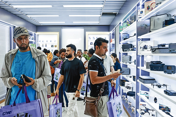 无人机及人工智能装备区的人气同样居高不下。科技感十足的无人机展陈区前围满了外商,巴基斯坦客商扎因仔细观察着无人机,并和朋友在展陈区前频频合影。“此前通过社交媒体了解过义乌的实力,今日实地一看,比预期更令人震撼。”扎因直起身,指着展台上的设备告诉记者,“白天的考察已经收获满满,听说夜晚这里会变身‘光影魔术城’,还有无人机表演,已经和同行的朋友约好,一定要感受这份科技与艺术交融的惊喜。”