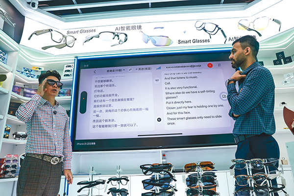 经营户头戴高科技眼镜,用实时翻译软件与外商洽谈。