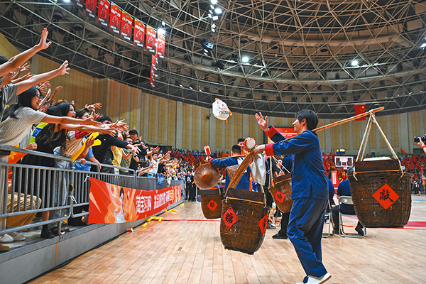 10月18日晚,“浙BA”城市争霸赛金华队VS温州队火热开赛,浓郁的义乌元素成为赛场内外的亮丽风景。开赛前,场馆外的全球吃货节美食市集人气爆棚,义乌本土美食与各国美食令球迷们大饱口福。比赛中场,由义乌带来的精彩节目《义乌义》《东洲大鼓》更是点燃全场。“义乌货郎担”惊喜现身,向球迷派送礼品,将现场气氛推向高潮。 全媒体记者 王怿杰 摄