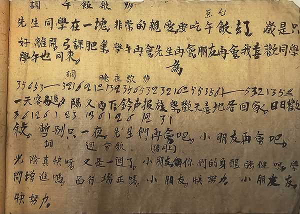 在一叠刊物中,几张手抄曲谱尤为特别。工整的五线谱旁,《午饭歌》的歌词温暖质朴:“先生同学在一块,非常的亲爱,要吃午饭去了,于是只好离开……一天容易过,夕阳又西下,铃声报放学,欢天喜地各回家。日日欢叙,暂别只一夜,先生们再会吧,小朋友再会吧。光阴真快呀,又是一周了。小朋友你们的身体强健吗,学问增进吗,品行端正吗,小朋友快努力,小朋友快努力。”这些创作于烽火年代的校园歌曲,既是对和平生活的向往,也是对文化传承的坚守。