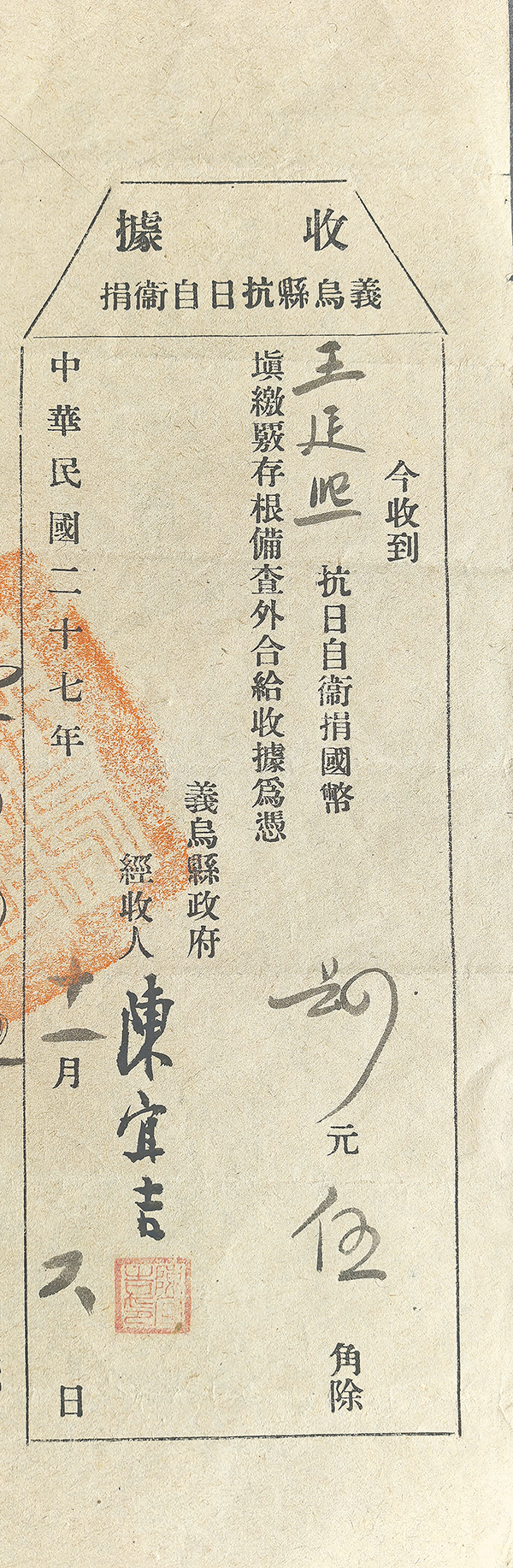 《义乌财税志》明确记载,1938年,义乌县政府尚未缴足“救国公债款”认购额的半数者筹募“自卫捐款”,次年改名为“抗日自卫事业费”,按上年派额增加三分之二,两年共募收8.2万元。1940年起由省统筹。1942年1月停征。而“自卫谷”作为实物税种,直接保障了地方抗日武装的粮食供给。