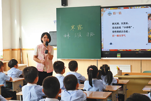 “寒露到了,要记得赏菊花;冬至时节,北方吃饺子,南方吃汤圆……”每到节气,楼舒雯总会与班里的学生围坐在一起,分享节气知识,让学生们化身“小小诵读员”,带来节气的问候。这份对传统文化的热情,源于她创新的“二十四节气朗读”教学法。