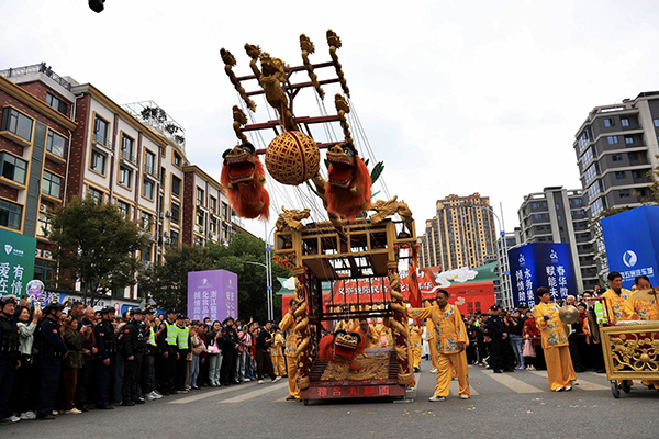 本次嘉年华不仅是一场节庆盛宴,更是一座活态传承的民俗文化舞台。在踩街秀中,首当其冲的就是国家级非遗九狮图表演,这是提线木偶和地面舞狮相结合而产生的民间舞蹈艺术,因九狮凌空表演,有“节日到,九狮跳”之说。9名表演人员通过纤绳“遥控指挥”9只狮子,伴随着现场锣鼓演奏,九狮的动作随着音乐节奏的强弱而变化莫测,群狮抢球、单狮戏球、双狮挪球、绣球开苞、明珠落盘、三狮会宴等,象征风调雨顺、五谷丰登的美好愿望。