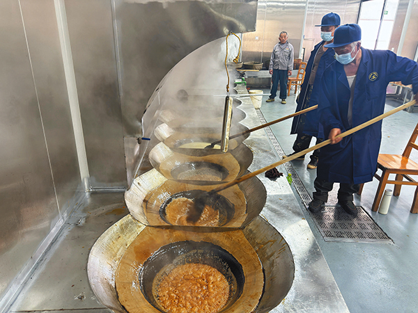 “看完这里的图文展览,就可以去旁边的糖坊一睹红糖非遗制作技艺的整个流程。”在曹新宇的带领下,《王村寻甜记》拍摄团队走进现代化生产线,透过参观廊的超大视窗记录红糖生产全过程。此刻,糖坊门头上方,大屏里循环播放着“上品红糖”的宣传视频,两块小屏则清晰显示着各个生产环节的实时视频。